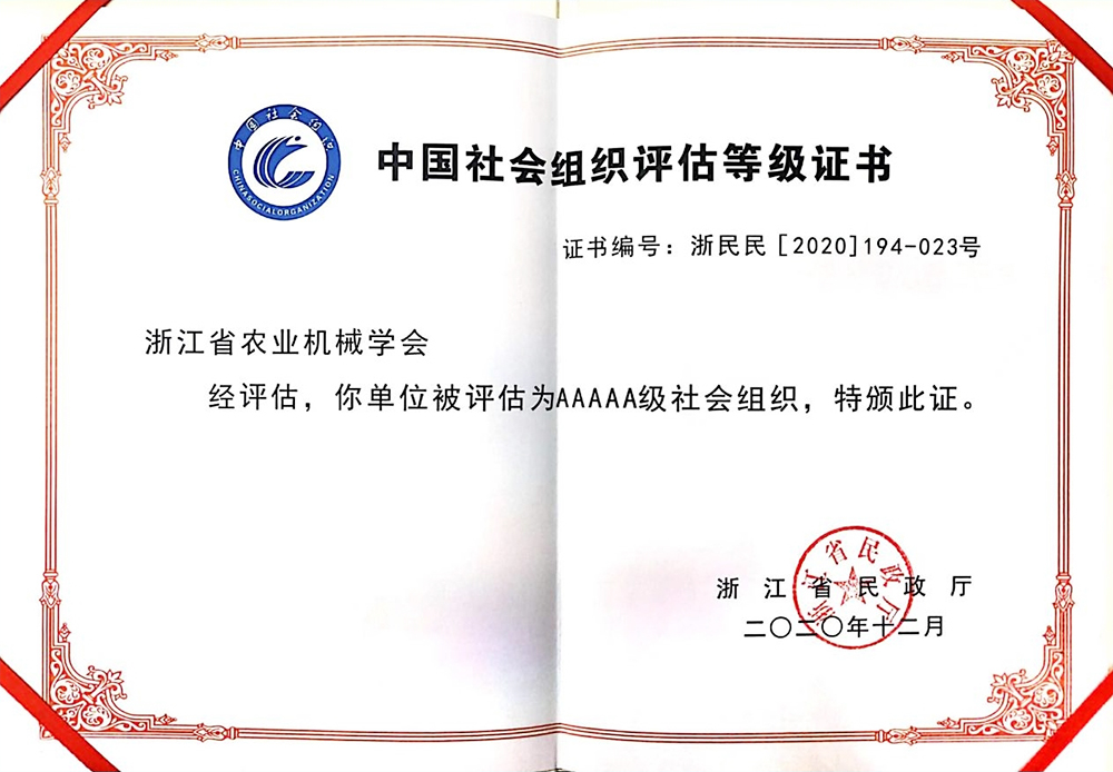 浙江省农业机械学会获评5A级社会组织证书
